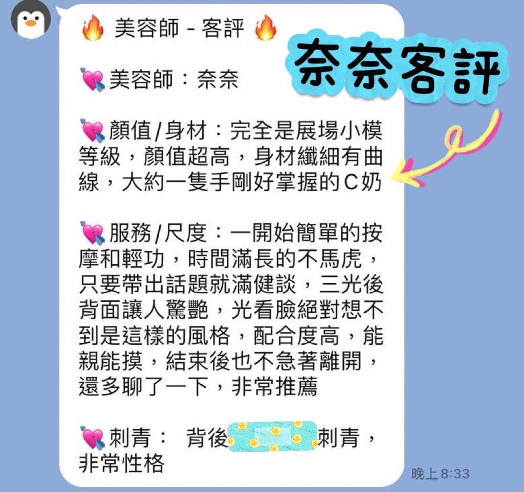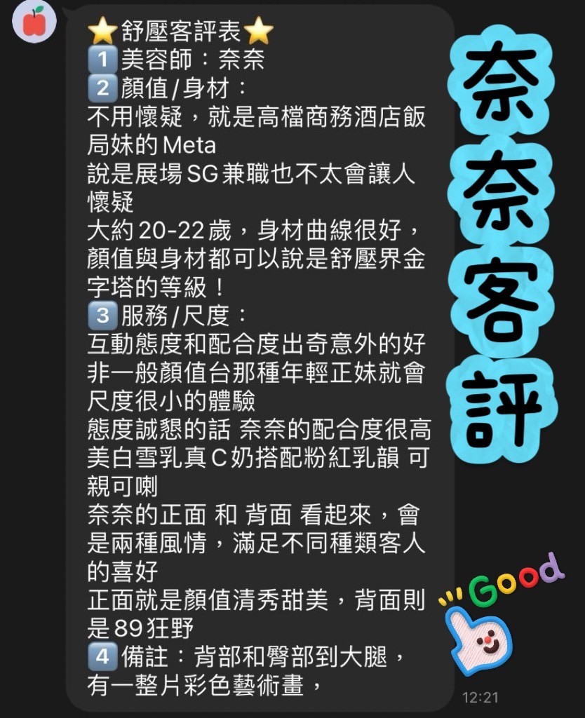 妹妹介紹: 大家好,我是奈奈,我自己覺得我長得算是漂亮且充滿自信的美容師。並且擁有曲線分明的身材和甜美的外貌,我在這個行業中提供哥哥們高品質的舒壓體驗。我深知每位客人的需求都是獨特的,因此無論你尋求的是甜美清秀的陪伴還是狂野奔放的互動,我都能夠以誠懇的態度和高度的配合度,讓你享受與眾不同的舒壓時光。<br /> <br /> 在我的服務過程中,無論正面來還是背面來,我都能展現出不同的魅力風格,確保每位客人都能找到最適合自己需求的滿意體驗。我相信,通過我的服務,你將會體驗到前所未有的舒適和放鬆。請來找我吧!